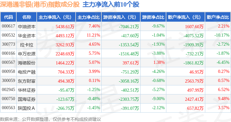 资金流向方面,深港通非银(港币)(983054)指数成份股当日主力资金净流出合计2.05亿元,游资资金净流出合计2.91亿元,散户资金净流入合计4.96亿元。成份股资金流向详情见下表: