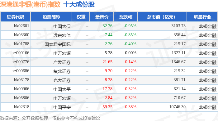 深港通非银(港币)(983054)指数十大成份股详情如下: