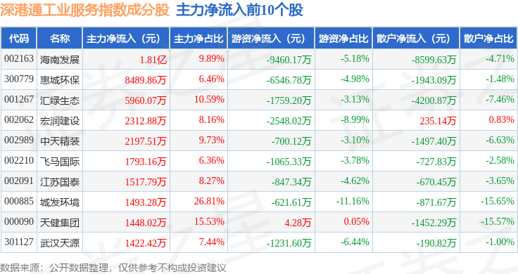 资金流向方面,深港通工业服务(983055)指数成份股当日主力资金净流出合计3.12亿元,游资资金净流出合计3.16亿元,散户资金净流入合计6.28亿元。成份股资金流向详情见下表: