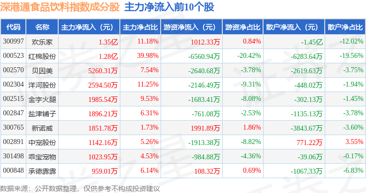 资金流向方面,深港通食品饮料(983065)指数成份股当日主力资金净流出合计1.38亿元,游资资金净流出合计4770.87万元,散户资金净流入合计1.86亿元。成份股资金流向详情见下表: