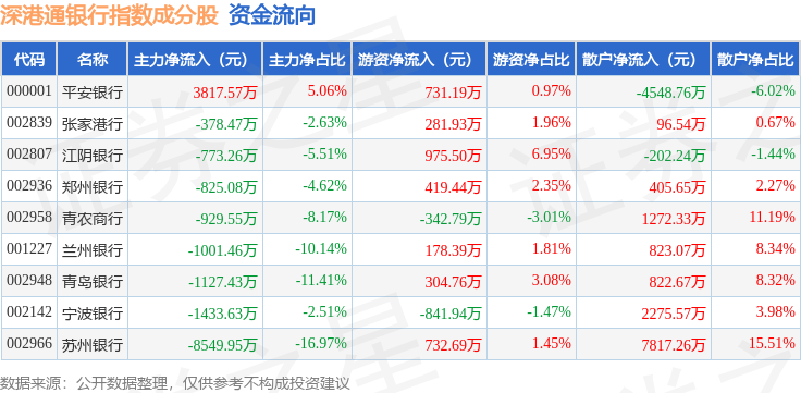 资金流向方面,深港通银行(983081)指数成份股当日主力资金净流出合计1.12亿元,游资资金净流入合计2439.17万元,散户资金净流入合计8762.1万元。成份股资金流向详情见下表: