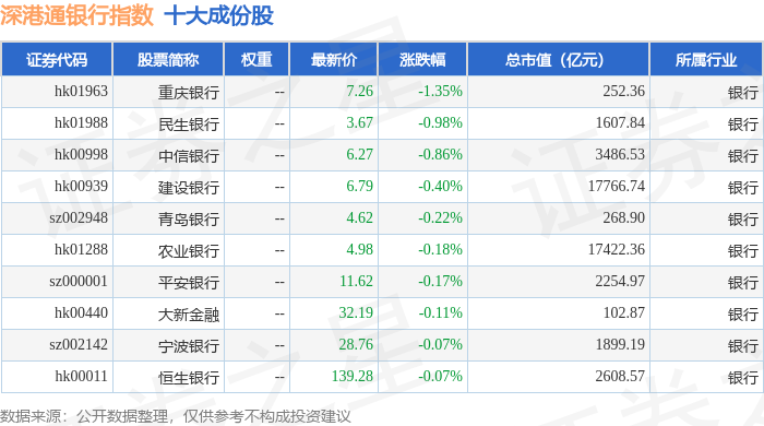 证券之星消息,12月19日,深港通银行(983081)指数报收于7571.18点,涨0.24%,成交76.25亿元,换手率0.16%。当日该指数成份股中,上涨的有17家,渣打集团以1.74%的涨幅领涨,下跌的有10家,重庆银行以1.35%的跌幅领跌。