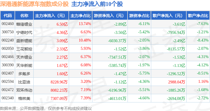资金流向方面,深港通新能源车(983087)指数成份股当日主力资金净流入合计23.89亿元,游资资金净流出合计14.26亿元,散户资金净流出合计9.62亿元。成份股资金流向详情见下表: