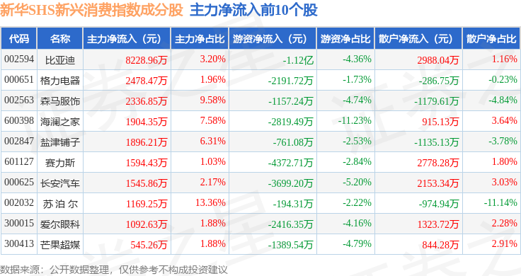 资金流向方面,新华SHS新兴消费(989006)指数成份股当日主力资金净流出合计5714.79万元,游资资金净流出合计4.21亿元,散户资金净流入合计4.79亿元。成份股资金流向详情见下表:
