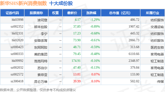 新华SHS新兴消费(989006)指数十大成份股详情如下: