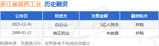 证券之星消息,根据天眼查APP于12月16日公布的信息整理,浙江省医药工业有限公司并购融资,融资额5亿人民币,参与投资的机构包括白云山,投后估值5亿人民币。