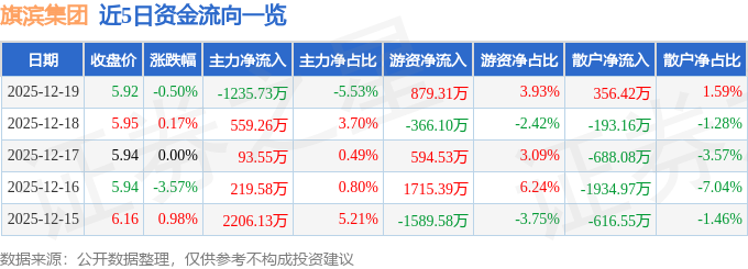 证券之星消息,截至2025年12月19日收盘,旗滨集团(601636)报收于5.92元,下跌0.5%,换手率1.27%,成交量37.67万手,成交额2.24亿元。
