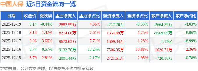 证券之星消息,截至2025年12月19日收盘,中国人保(601319)报收于9.14元,下跌0.44%,换手率0.2%,成交量72.4万手,成交额6.62亿元。