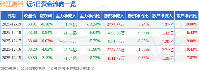 证券之星消息,截至2025年12月19日收盘,张江高科(600895)报收于38.01元,下跌0.18%,换手率2.21%,成交量34.25万手,成交额13.06亿元。