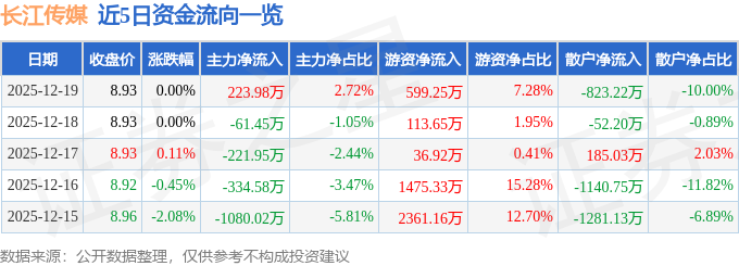 证券之星消息,截至2025年12月19日收盘,长江传媒(600757)报收于8.93元,上涨0.0%,换手率0.76%,成交量9.21万手,成交额8230.87万元。