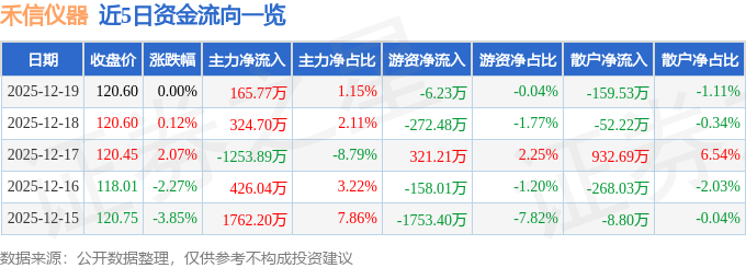 证券之星消息,截至2025年12月19日收盘,禾信仪器(688622)报收于120.6元,上涨0.0%,换手率1.67%,成交量1.18万手,成交额1.44亿元。