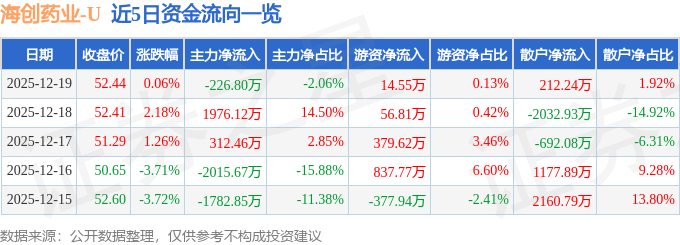 证券之星消息,截至2025年12月19日收盘,海创药业(688302)报收于52.44元,上涨0.06%,换手率2.1%,成交量2.08万手,成交额1.1亿元。