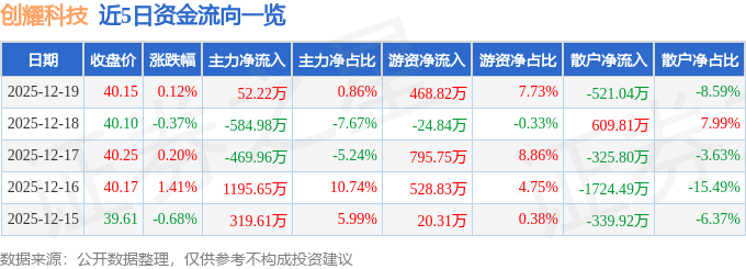 12月19日的资金流向数据方面,主力资金净流入52.22万元,占总成交额0.86%,游资资金净流入468.82万元,占总成交额7.73%,散户资金净流出521.04万元,占总成交额8.59%。