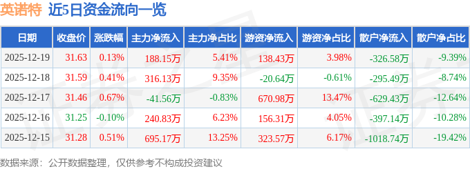 12月19日的资金流向数据方面,主力资金净流入188.15万元,占总成交额5.41%,游资资金净流入138.43万元,占总成交额3.98%,散户资金净流出326.58万元,占总成交额9.39%。