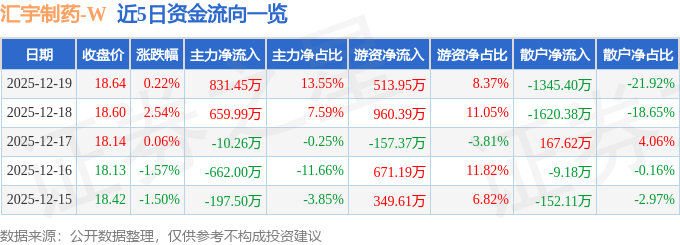 证券之星消息,截至2025年12月19日收盘,汇宇制药(688553)报收于18.64元,上涨0.22%,换手率0.96%,成交量3.28万手,成交额6137.39万元。