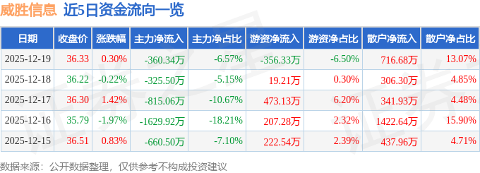 证券之星消息,截至2025年12月19日收盘,威胜信息(688100)报收于36.33元,上涨0.3%,换手率0.31%,成交量1.5万手,成交额5485.2万元。