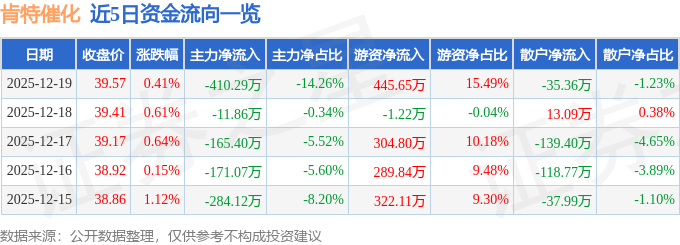 证券之星消息,截至2025年12月19日收盘,肯特催化(603120)报收于39.57元,上涨0.41%,换手率3.23%,成交量7289.0手,成交额2877.39万元。