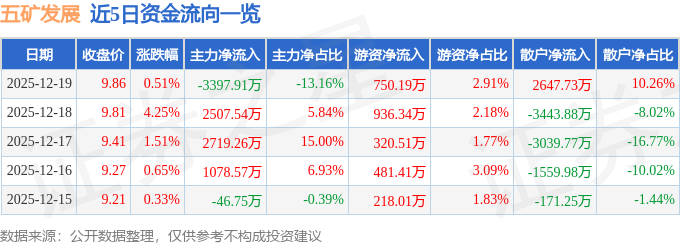 证券之星消息,截至2025年12月19日收盘,五矿发展(600058)报收于9.86元,上涨0.51%,换手率2.46%,成交量26.35万手,成交额2.58亿元。