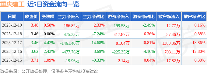 证券之星消息,截至2025年12月19日收盘,重庆建工(600939)报收于3.48元,上涨0.58%,换手率1.22%,成交量23.22万手,成交额8010.78万元。