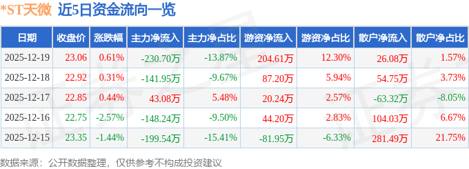 证券之星消息,截至2025年12月19日收盘,*ST天微(688511)报收于23.06元,上涨0.61%,换手率0.7%,成交量7234.0手,成交额1663.1万元。