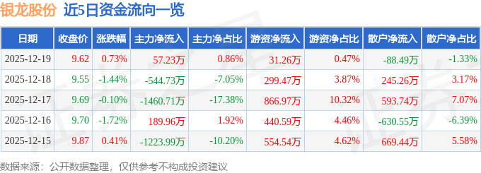 证券之星消息,截至2025年12月19日收盘,银龙股份(603969)报收于9.62元,上涨0.73%,换手率0.82%,成交量6.89万手,成交额6628.9万元。