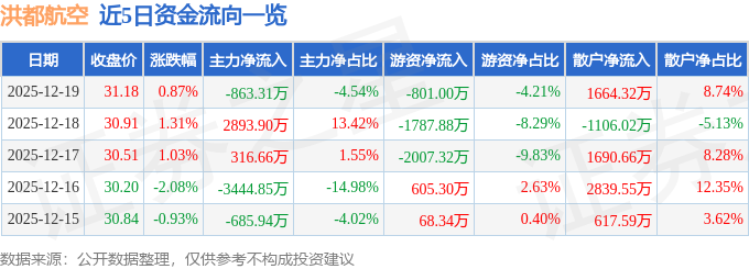 证券之星消息,截至2025年12月19日收盘,洪都航空(600316)报收于31.18元,上涨0.87%,换手率0.85%,成交量6.09万手,成交额1.9亿元。