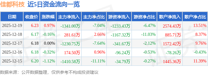 证券之星消息,截至2025年12月19日收盘,佳都科技(600728)报收于6.23元,上涨0.97%,换手率1.43%,成交量30.49万手,成交额1.91亿元。