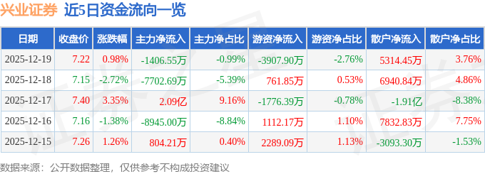 证券之星消息,截至2025年12月19日收盘,兴业证券(601377)报收于7.22元,上涨0.98%,换手率2.26%,成交量195.21万手,成交额14.15亿元。