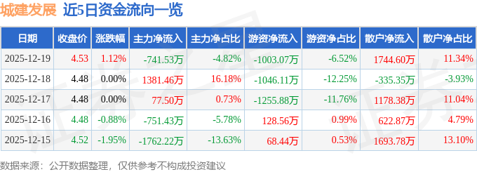 证券之星消息,截至2025年12月19日收盘,城建发展(600266)报收于4.53元,上涨1.12%,换手率1.64%,成交量33.97万手,成交额1.54亿元。