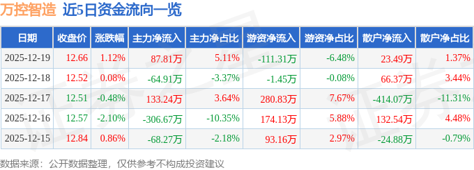 证券之星消息,截至2025年12月19日收盘,万控智造(603070)报收于12.66元,上涨1.12%,换手率0.34%,成交量1.36万手,成交额1718.87万元。