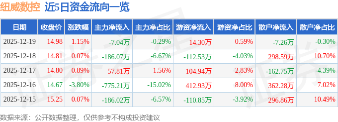 证券之星消息,截至2025年12月19日收盘,纽威数控(688697)报收于14.98元,上涨1.15%,换手率0.36%,成交量1.62万手,成交额2432.81万元。