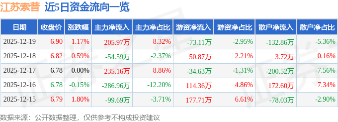 12月19日的资金流向数据方面,主力资金净流入205.97万元,占总成交额8.32%,游资资金净流出73.11万元,占总成交额2.95%,散户资金净流出132.86万元,占总成交额5.36%。