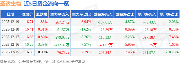 证券之星消息,截至2025年12月19日收盘,圣达生物(603079)报收于16.71元,上涨1.83%,换手率1.35%,成交量2.32万手,成交额3852.69万元。