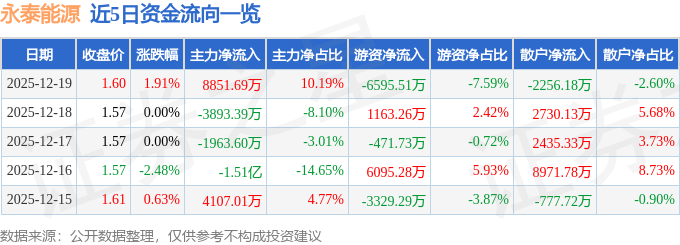 证券之星消息,截至2025年12月19日收盘,永泰能源(600157)报收于1.6元,上涨1.91%,换手率2.5%,成交量545.05万手,成交额8.68亿元。