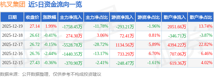 证券之星消息,截至2025年12月19日收盘,杭叉集团(603298)报收于27.14元,上涨1.99%,换手率0.42%,成交量5.52万手,成交额1.49亿元。