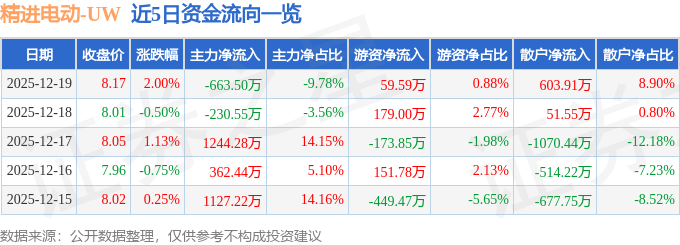 证券之星消息,截至2025年12月19日收盘,精进电动(688280)报收于8.17元,上涨2.0%,换手率1.6%,成交量8.31万手,成交额6786.14万元。