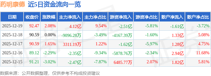 12月19日的资金流向数据方面,主力资金净流入4.12亿元,占总成交额9.54%,游资资金净流出2.51亿元,占总成交额5.81%,散户资金净流出1.61亿元,占总成交额3.72%。