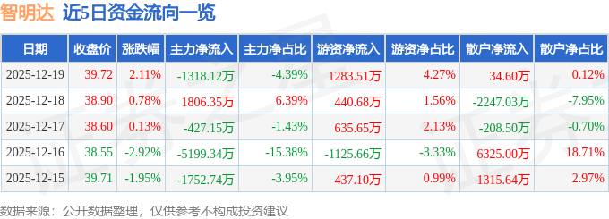 证券之星消息,截至2025年12月19日收盘,智明达(688636)报收于39.72元,上涨2.11%,换手率4.52%,成交量7.58万手,成交额3.01亿元。