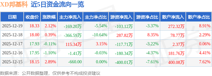 证券之星消息,截至2025年12月19日收盘,XD邦基科(603151)报收于18.33元,上涨2.12%,换手率0.98%,成交量1.68万手,成交额3056.14万元。