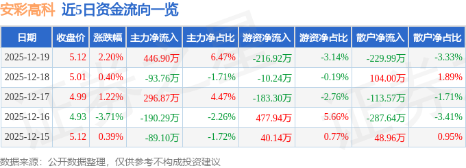 12月19日的资金流向数据方面,主力资金净流入446.9万元,占总成交额6.47%,游资资金净流出216.92万元,占总成交额3.14%,散户资金净流出229.99万元,占总成交额3.33%。