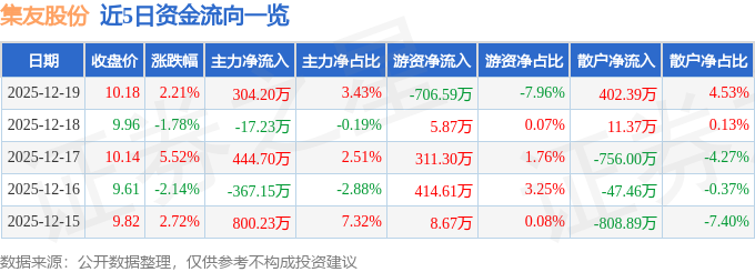 证券之星消息,截至2025年12月19日收盘,集友股份(603429)报收于10.18元,上涨2.21%,换手率1.68%,成交量8.81万手,成交额8874.97万元。