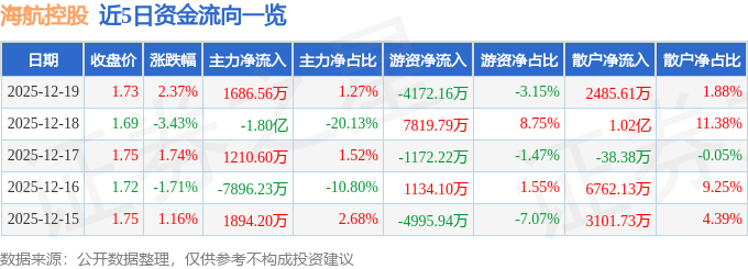 证券之星消息,截至2025年12月19日收盘,海航控股(600221)报收于1.73元,上涨2.37%,换手率2.36%,成交量777.43万手,成交额13.25亿元。