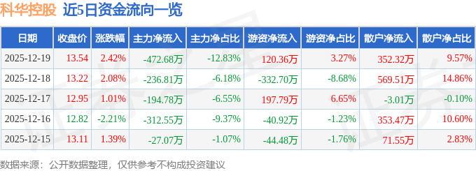 证券之星消息,截至2025年12月19日收盘,科华控股(603161)报收于13.54元,上涨2.42%,换手率1.43%,成交量2.74万手,成交额3683.41万元。