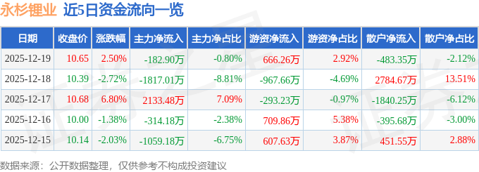 证券之星消息,截至2025年12月19日收盘,永杉锂业(603399)报收于10.65元,上涨2.5%,换手率4.24%,成交量21.73万手,成交额2.28亿元。