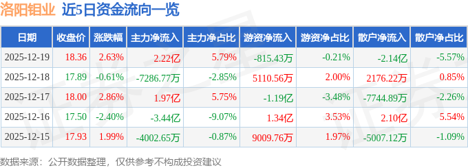 证券之星消息,截至2025年12月19日收盘,洛阳钼业(603993)报收于18.36元,上涨2.63%,换手率1.22%,成交量212.38万手,成交额38.42亿元。