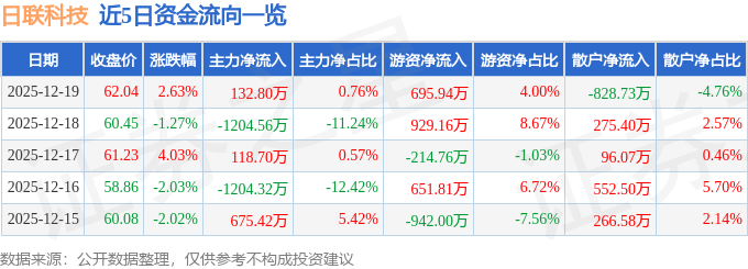 证券之星消息,截至2025年12月19日收盘,日联科技(688531)报收于62.04元,上涨2.63%,换手率2.64%,成交量2.83万手,成交额1.74亿元。