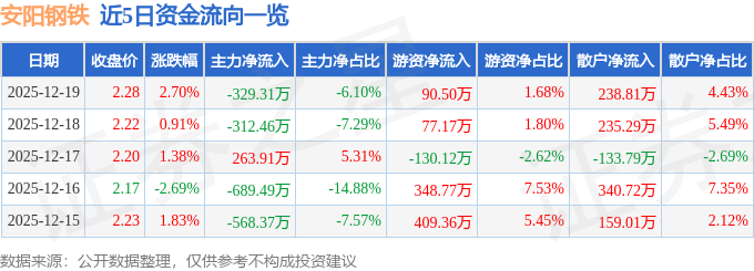证券之星消息,截至2025年12月19日收盘,安阳钢铁(600569)报收于2.28元,上涨2.7%,换手率0.83%,成交量23.91万手,成交额5395.68万元。