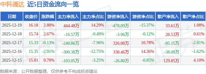 12月19日的资金流向数据方面,主力资金净流入444.48万元,占总成交额14.29%,游资资金净流出478.09万元,占总成交额15.37%,散户资金净流入33.61万元,占总成交额1.08%。