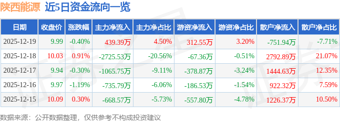 证券之星消息,截至2025年12月19日收盘,陕西能源(001286)报收于9.99元,下跌0.4%,换手率0.93%,成交量9.76万手,成交额9757.14万元。