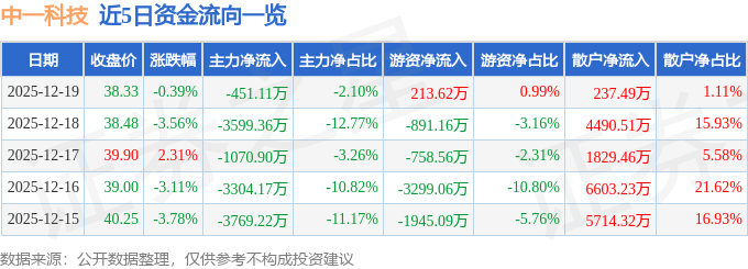 证券之星消息,截至2025年12月19日收盘,中一科技(301150)报收于38.33元,下跌0.39%,换手率2.52%,成交量5.6万手,成交额2.15亿元。